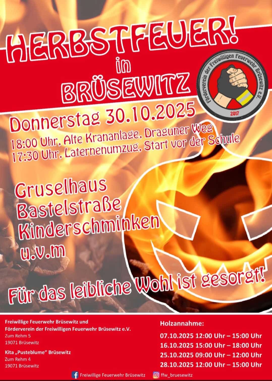 Am Donnerstag, 30.10.2025 lädt die Freiwillige Feuerwehr Brüsewitz herzlich zum gemütlichen Herbstfeuer an der Alten Krananlage (Draguner Weg) ein.