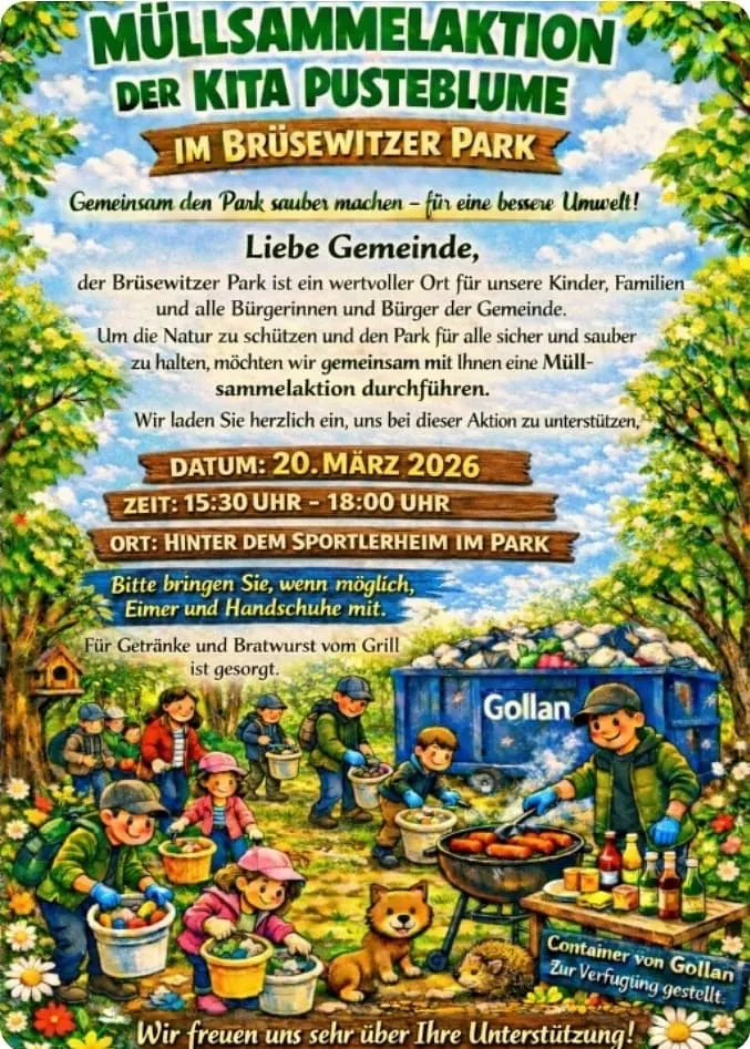 Gemeinsam für eine saubere Umwelt: Die Kita „Pusteblume“ lädt alle Bürgerinnen und Bürger zur Müllsammelaktion im Brüsewitzer Park ein.