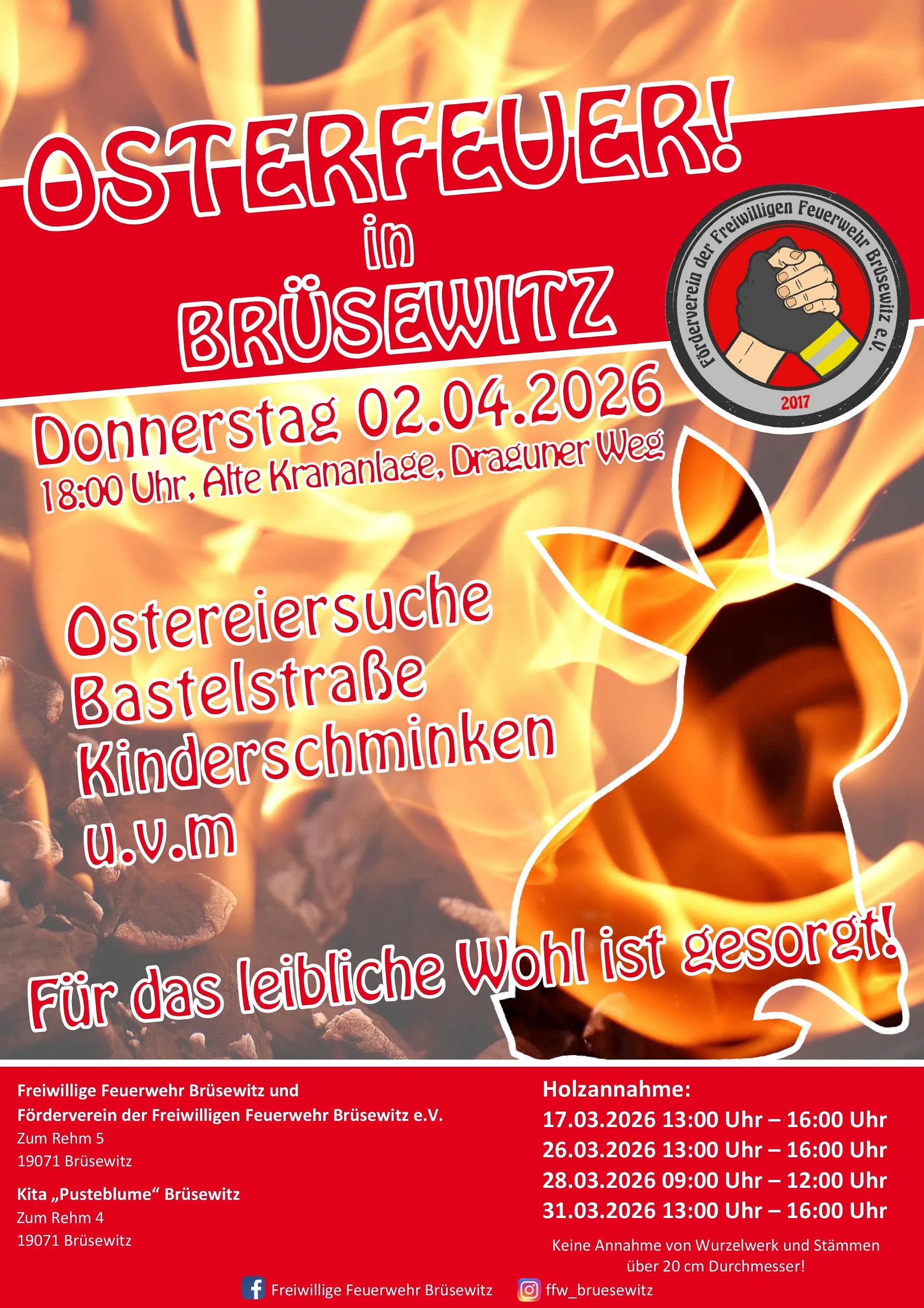 Die Freiwillige Feuerwehr Brüsewitz lädt auch in diesem Jahr wieder herzlich zum traditionellen Osterfeuer ein. Am Donnerstag, den 2. April 2026, geht es ab 18:00 Uhr an der alten Krananlage am Draguner Weg los.
