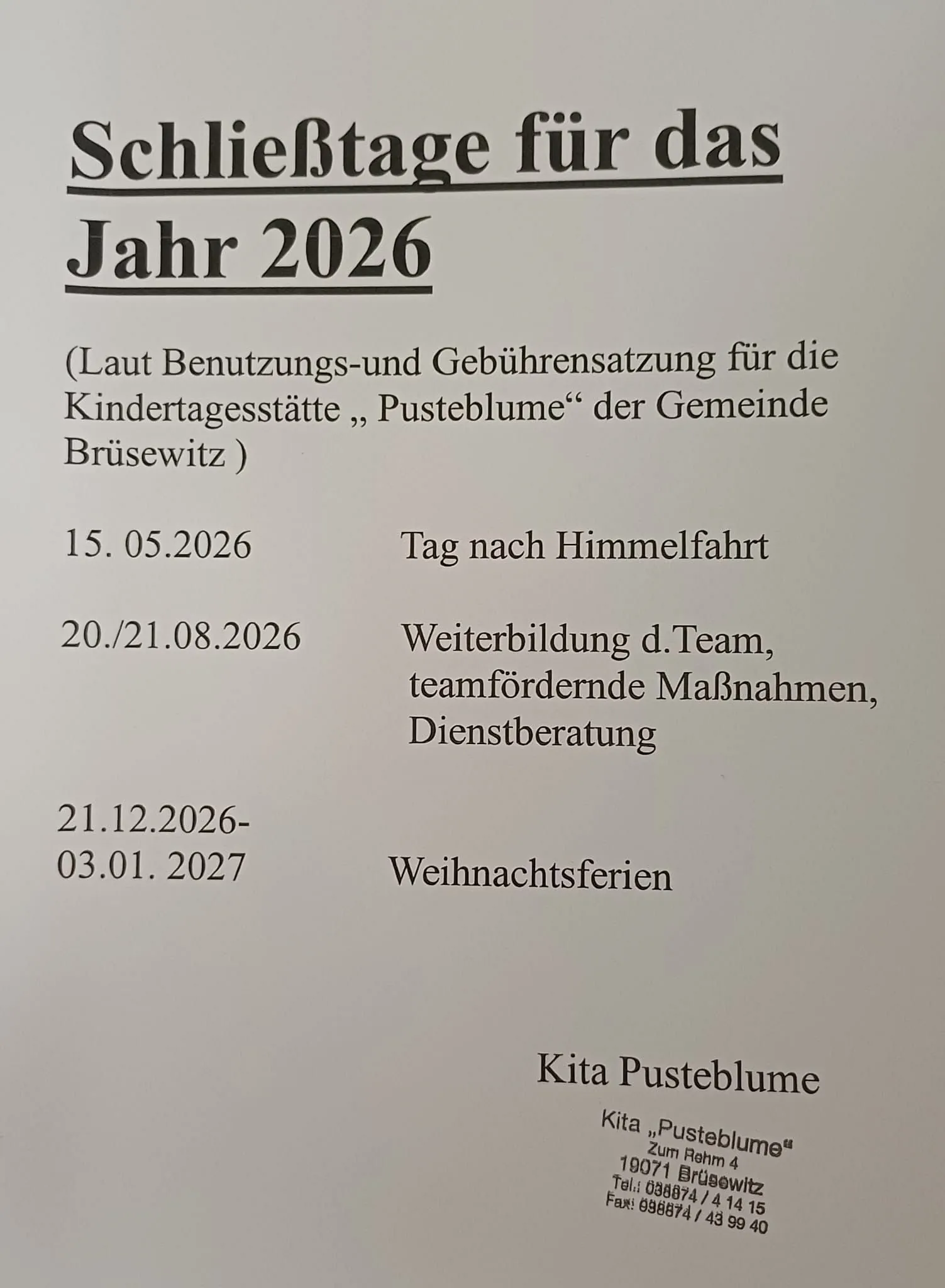 Schließtage der Kita „Pusteblume“ 2026