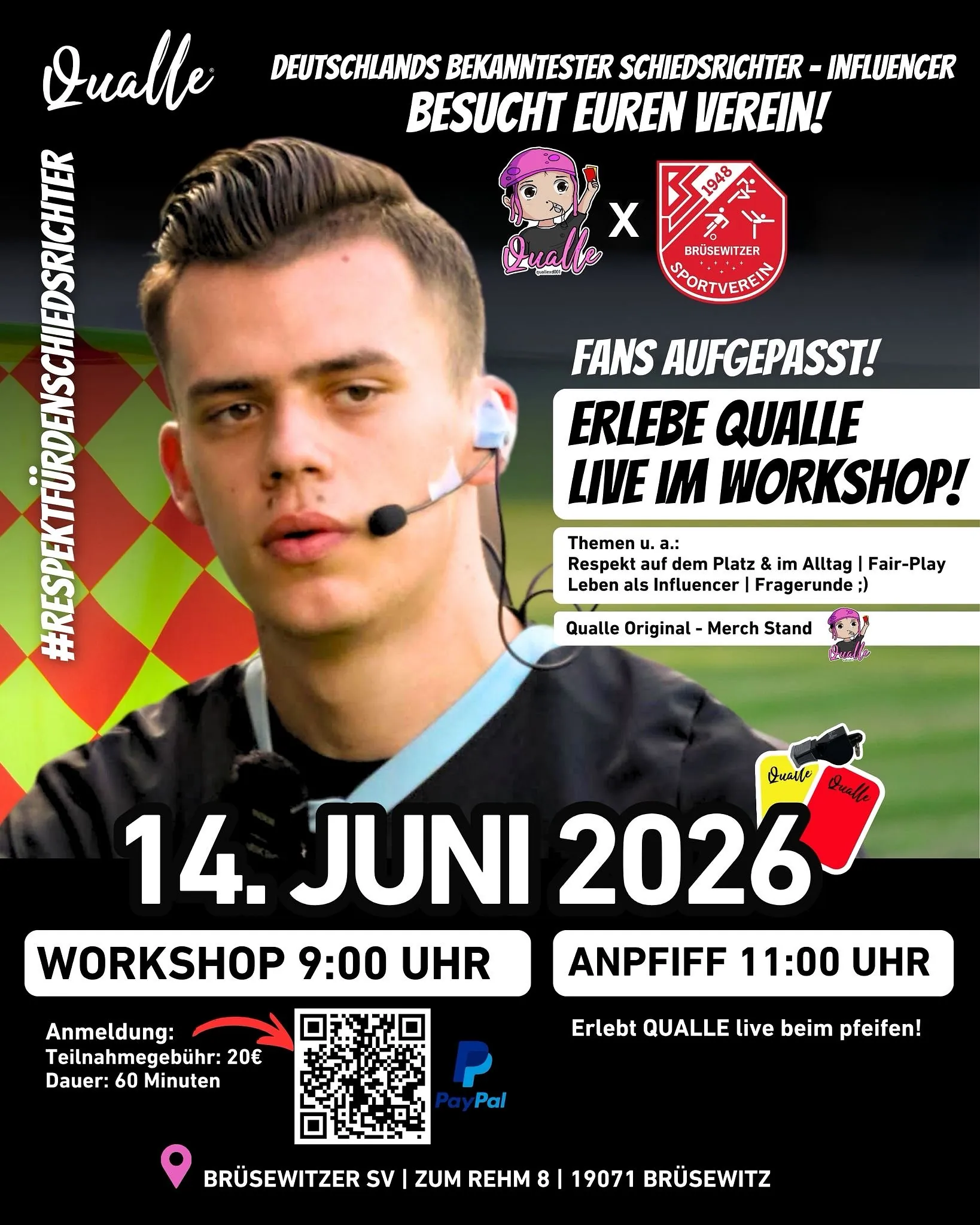 Ein besonderes Highlight erwartet unseren Verein am 14. Juni 2026: Deutschlands bekannter Schiedsrichter-Influencer „Qualle“ besucht den Brüsewitzer Sportverein und bringt spannende Einblicke aus seiner Welt mit.